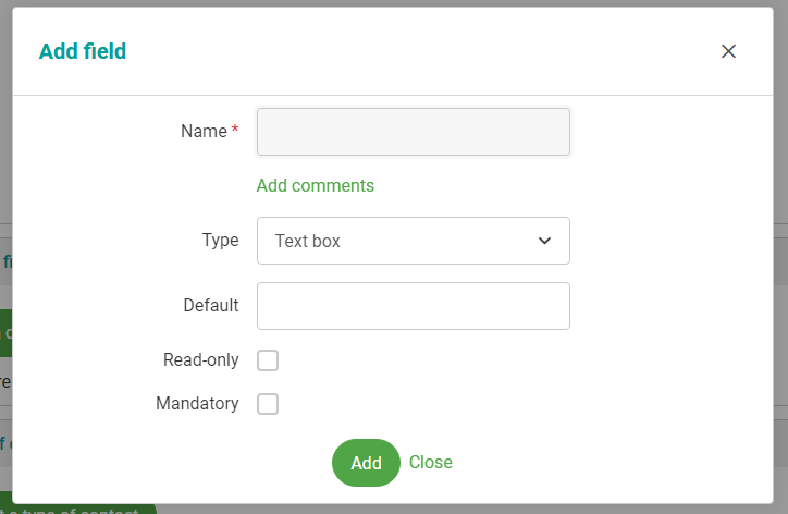 - If you want the new field to be mandatory, tick the "Mandatory" checkbox; otherwise leave it clear.