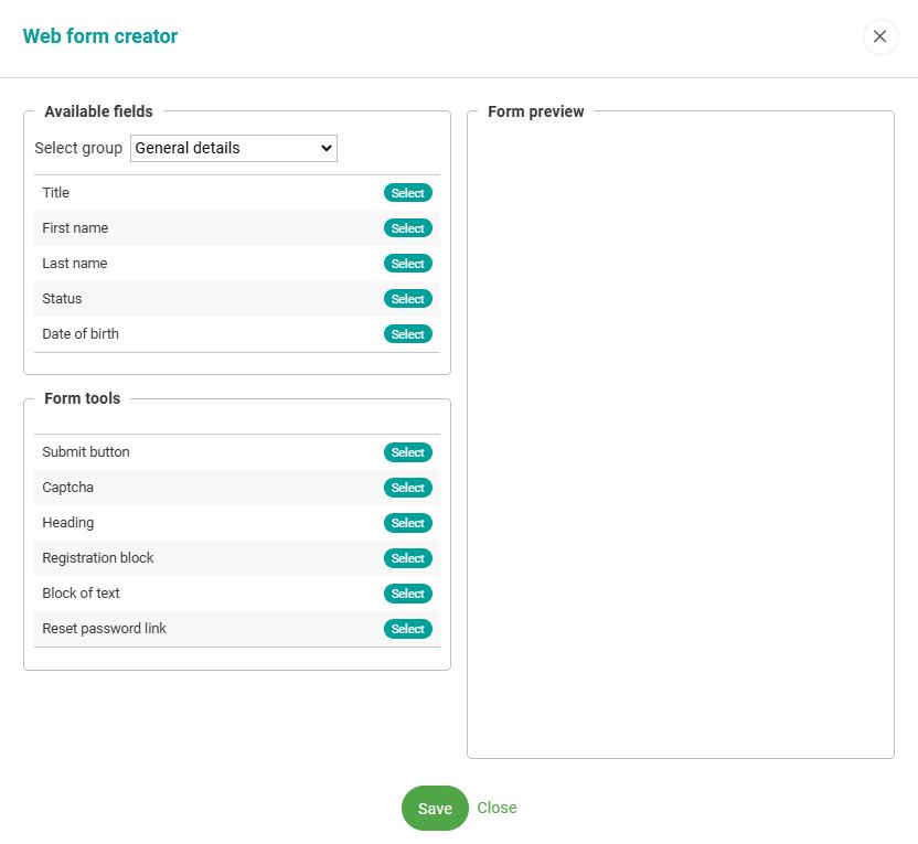 - Add whatever data fields, text and other features you need. Start by selecting a set of fields using the drop-down list at the top-left of the web form creator, then you'll see a listing of the related fields to select from.