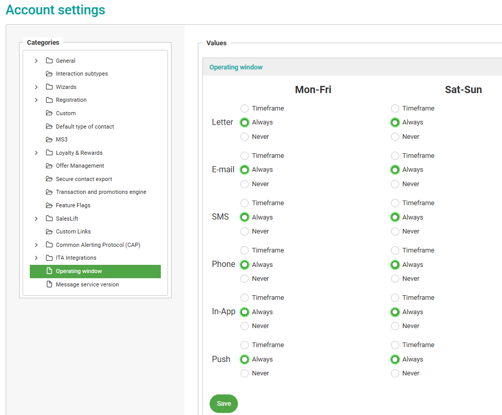 - Amend the operating window settings for the campaign message, as described above and click Save.