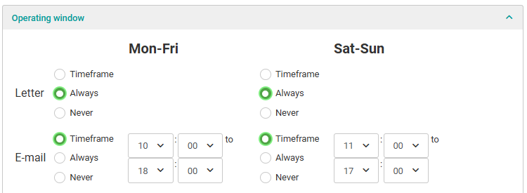 - Select the channel and the period you want to restrict and edit the times you want to send in.