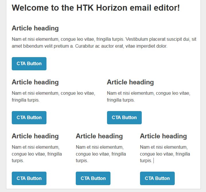 The simplest custom blocks in Horizon are basic 1, 2, 3 and 4 column rows. These can contain text, links, images etc and each column can be edited separately.