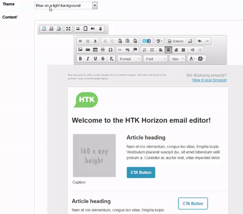 The overall styling of emails in Horizon controlled through “Themes”. Each Theme contains CSS (cascading style sheet) code that controls things like the background colour, foreground colour, default button colours, font colours, styles and sizes.