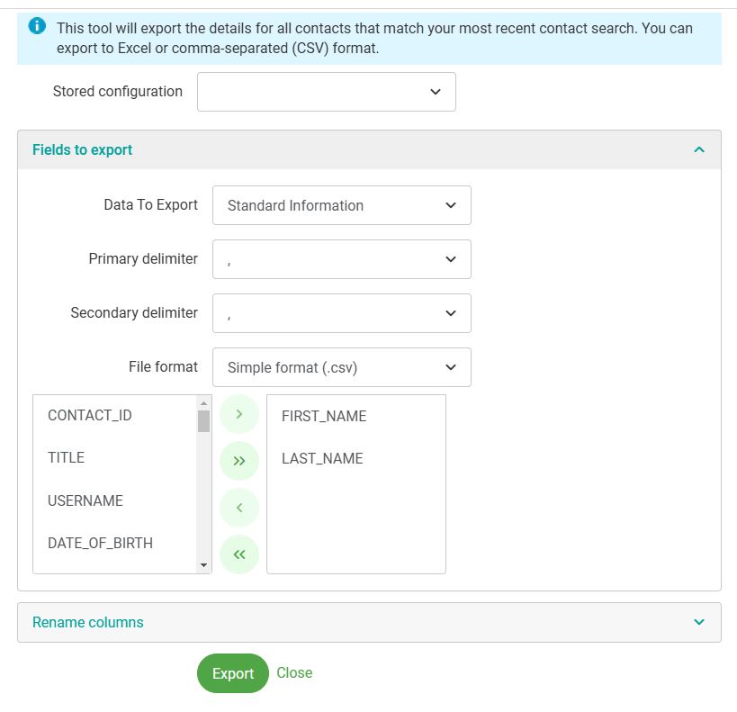 - The ‘Stored configuration’ option allows you to select previously saved export setting (as in Step 8. If you haven't done this, leave this blank)