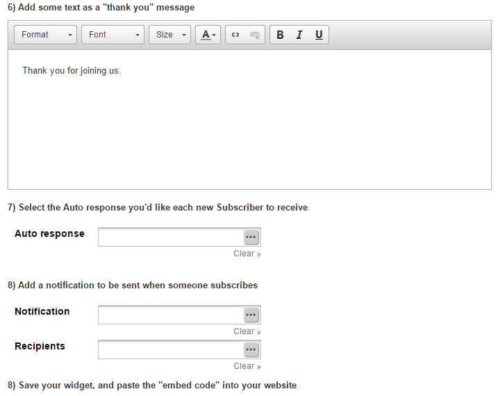- You can select an auto response message the customer will receive once they have signed up. You will need to create a message within the content area first.
