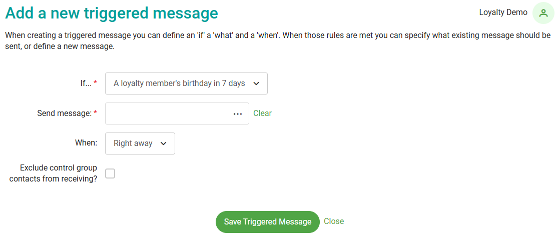 Triggered messages are a clever utility that takes away the need for manual intervention. It allows you to automatically send to loyalty members, when they match certain criteria. They are similar to scheduled messages, but with a focus on loyalty actions and the option for your message to be sent straight away after a member takes action, instead of waiting for the scheduled time.