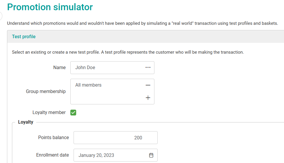 If the test profile is to be considered a loyalty member then it’s possible to specify their point balance.