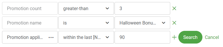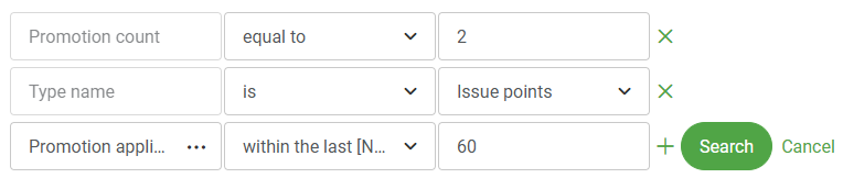 A count of the number of promotions applied. If a promotion name, subtype and or type is added to the search/rule group query then the count will be specific to an individual promotion, promotions of a particular subtype or promotions of a particular type. For example: “Promotion count = 2” as a search would return all contacts who have had 2 promotions applied. “Promotion count = 2 AND Promotion type = Issue points” as a search would return all contacts who have had 2 “Issue points” promotions applied. |