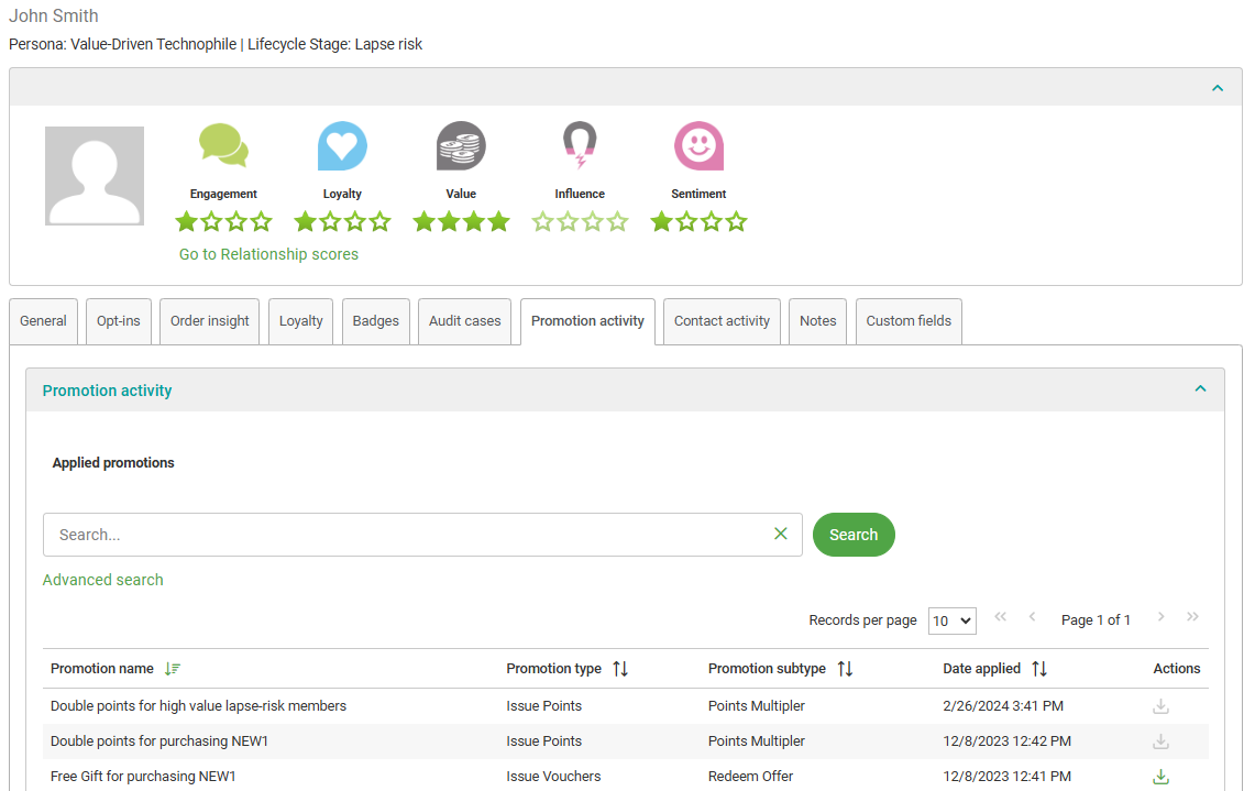 The promotion activity tab in a contact record shows all promotions that a contact has had applied to a transaction.