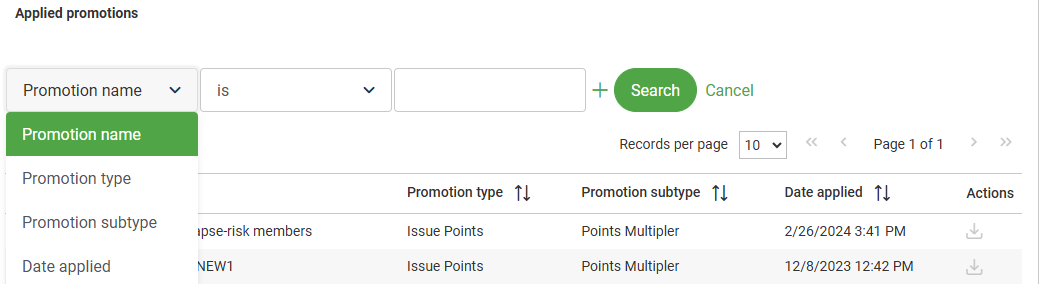 The following table details the attributes available when performing an advanced search on a contacts “applied promotions”.