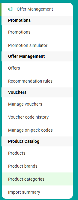 To add products, brands and categories via the user interface the user should navigate to Offer Management > Product Catalogue.